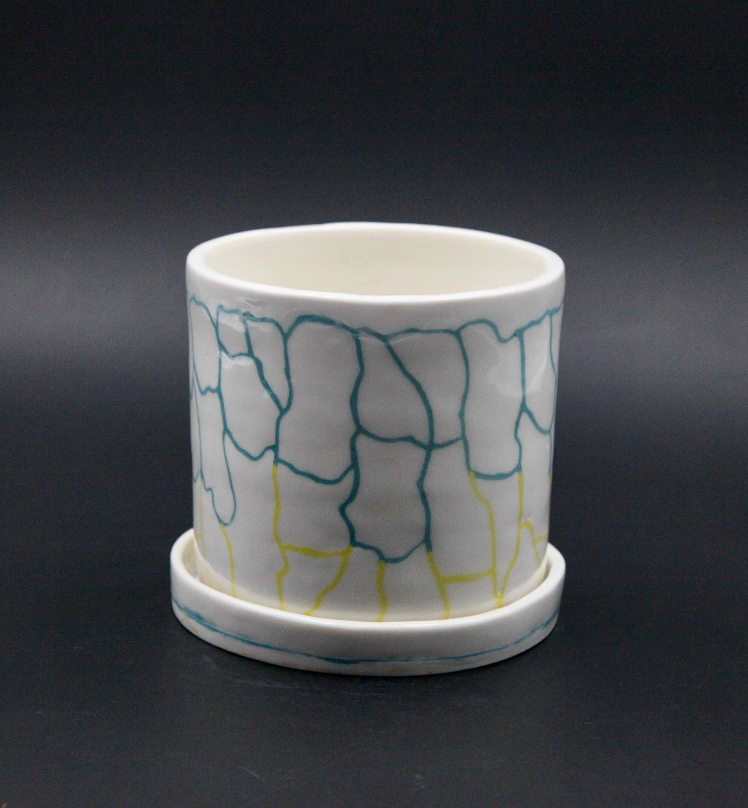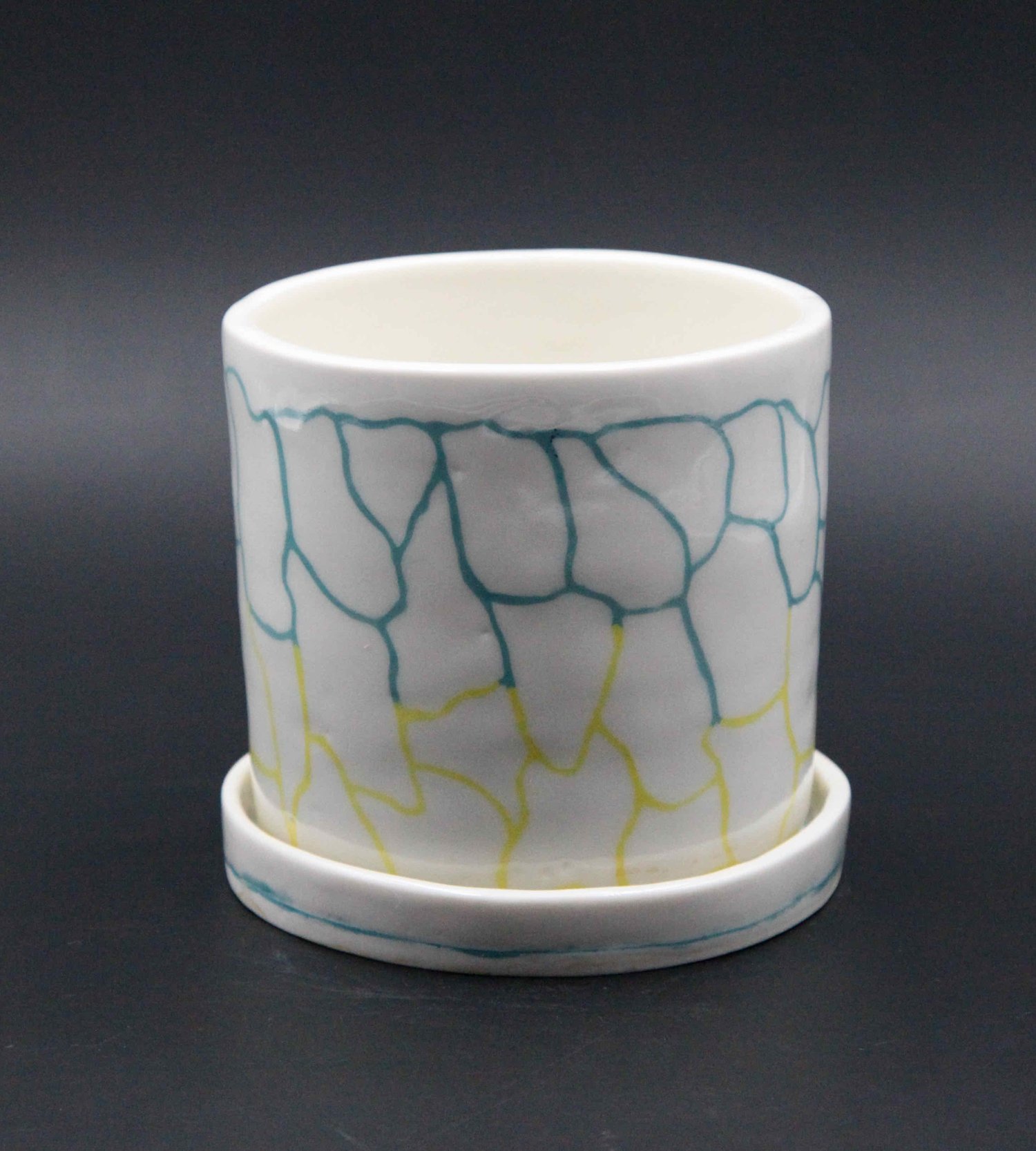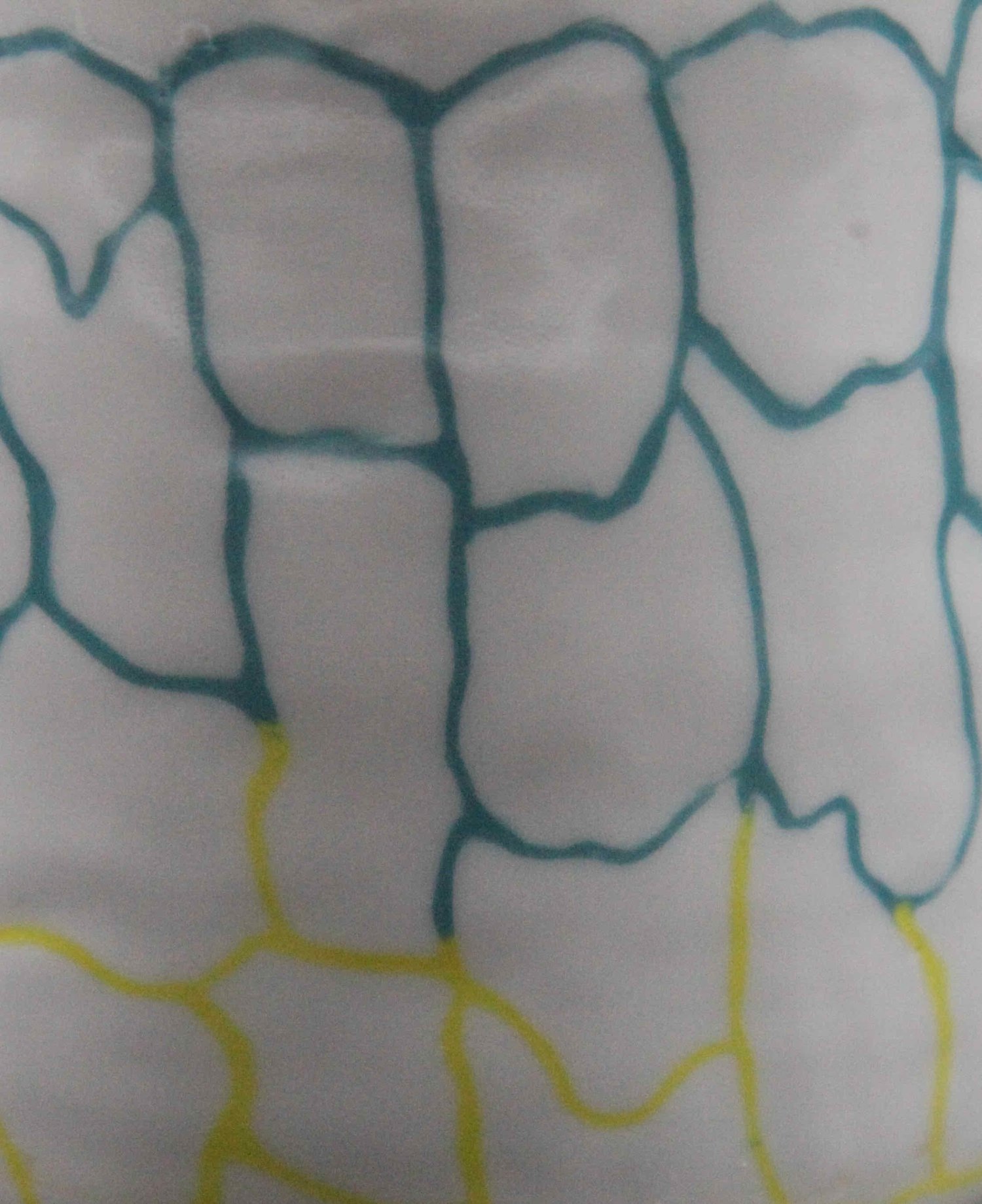 Céramique faite en porcelaine blanche Tournée, émaillée, décor mishima ( turquoise et jaune) représentant l'écorce Pièce unique Taille 12 x 12 cm